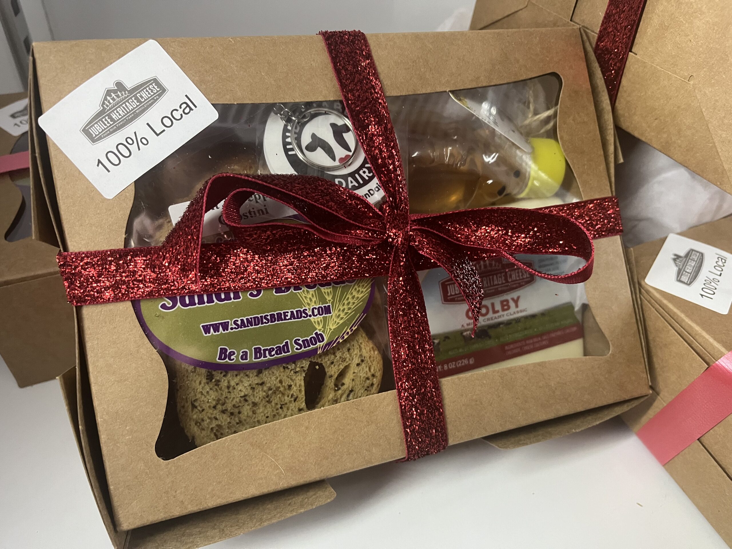 An all-in-one charcuterie box with 8oz block of cheese and sturdy plastic knife to cut it! Top with some of our own honey on a local crostini made from the finest flour ~ a little key chain or cow eraser for special